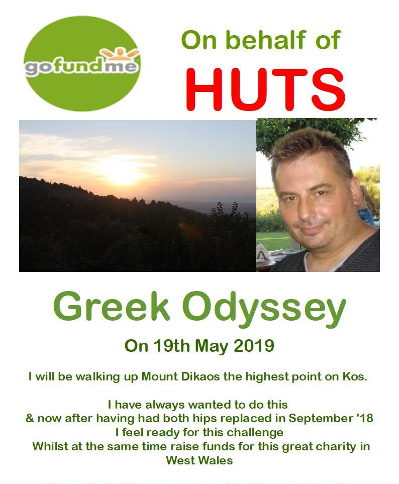 Mae'r linc uchod wedi ei greu gan Mike 'Alfie' Howard. Ar Fai 19eg, 2019, bwriada gerdded mynydd ar ynys Kos i godi arian i HUTS. Os hoffai unrhyw un gyfrannu, cliciwch ar y linc Go Fund Me, neu cwblhewch y ffurflen gais isod.